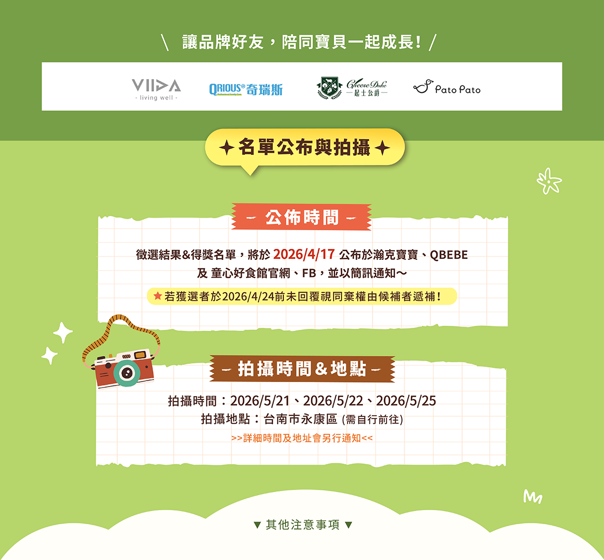 3. 參加年齡限出生於 2021年03月11日~ 2025年10月10日間者,獲選之寶貝須提供健保卡確認年齡,不符將取消資格,由候補者遞補。